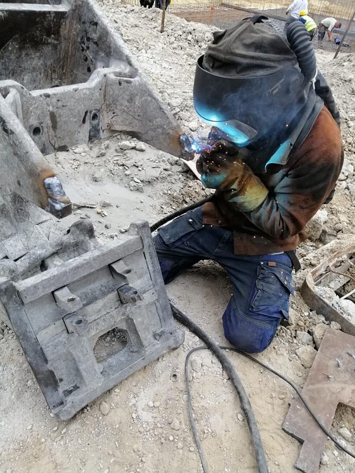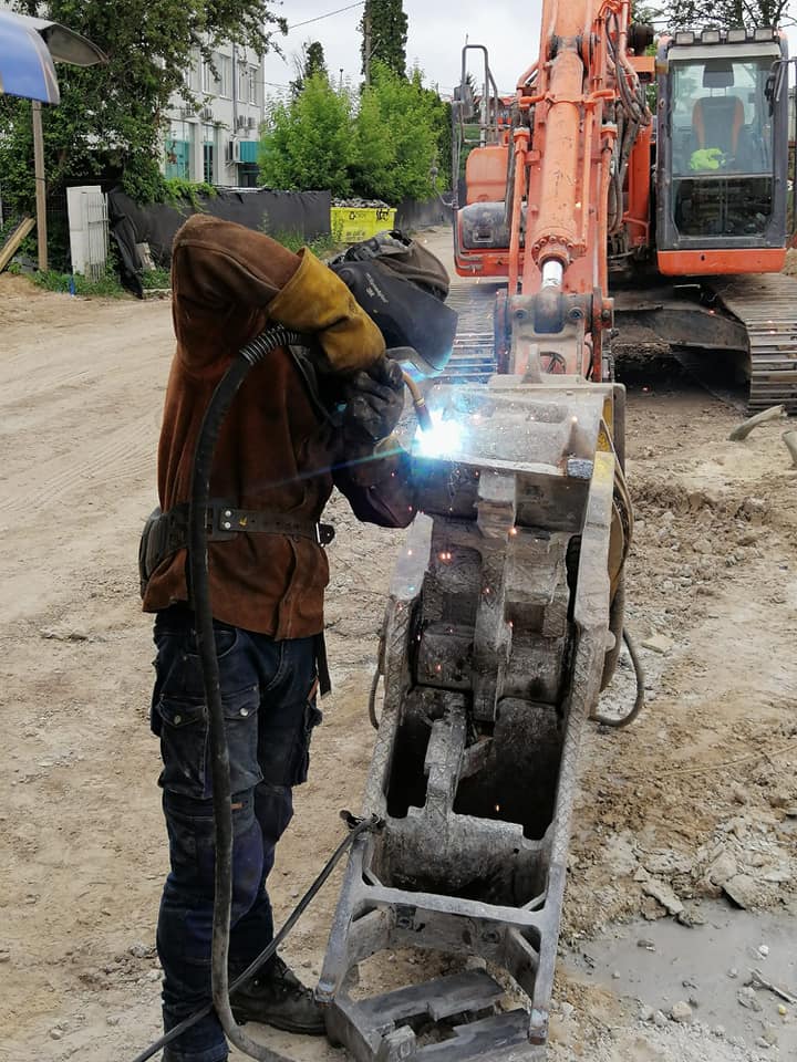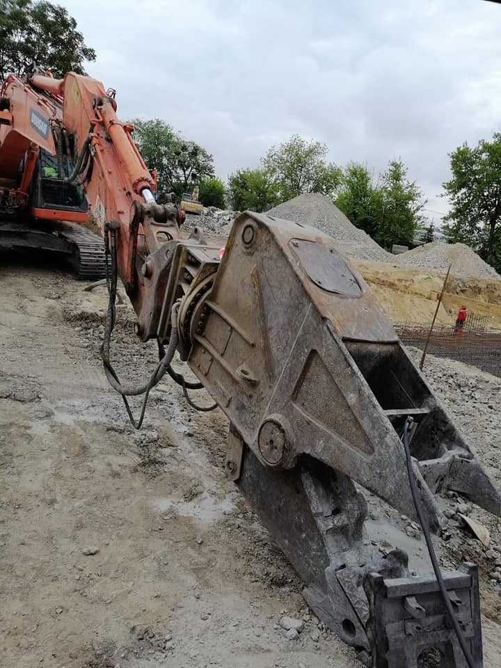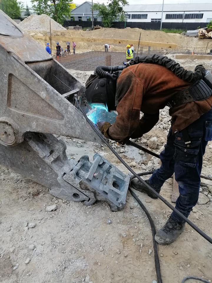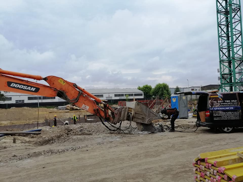 Rozbiórki to ciężki teren pracy nie tylko dla operatorów, ale także dla sprzętu. Gryzaki do betonu muszą być wytrzymałe i sprawne, dlatego zminimalizowaliśmy luzy i napawaliśmy nakładki. Dzięki naszej usłudze mobilnego spawania ciężki sprzęt budowlany Doosan mógł wrócić na plac.
