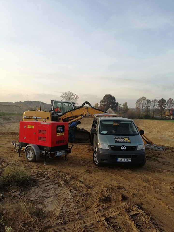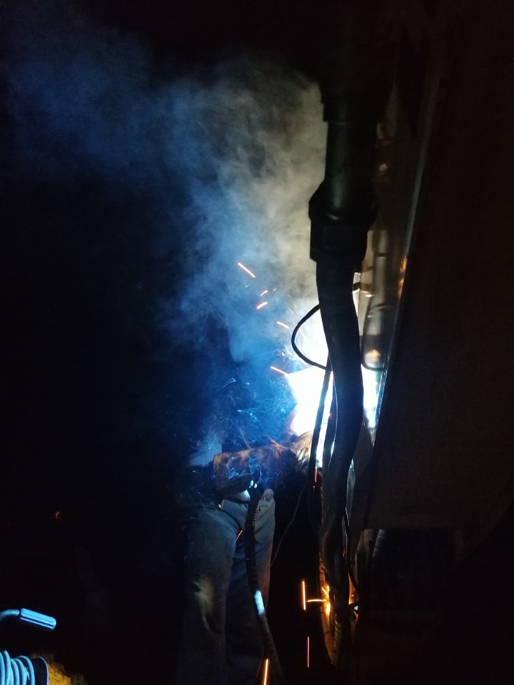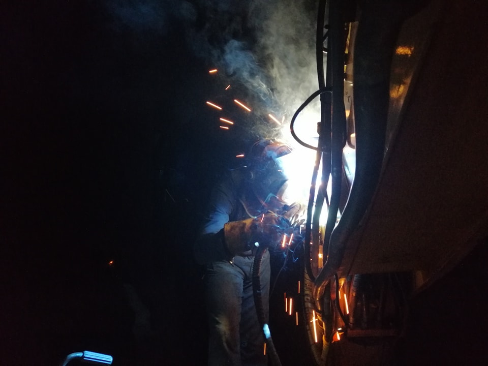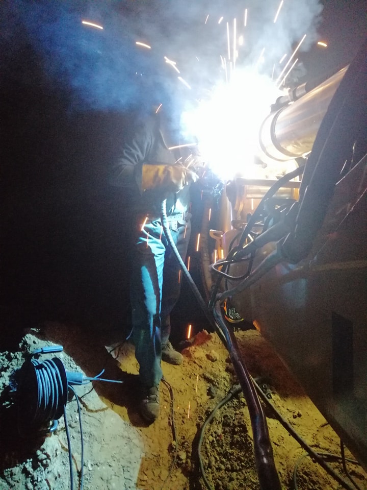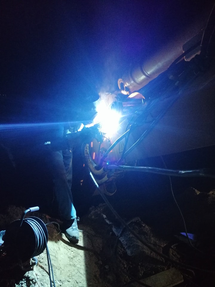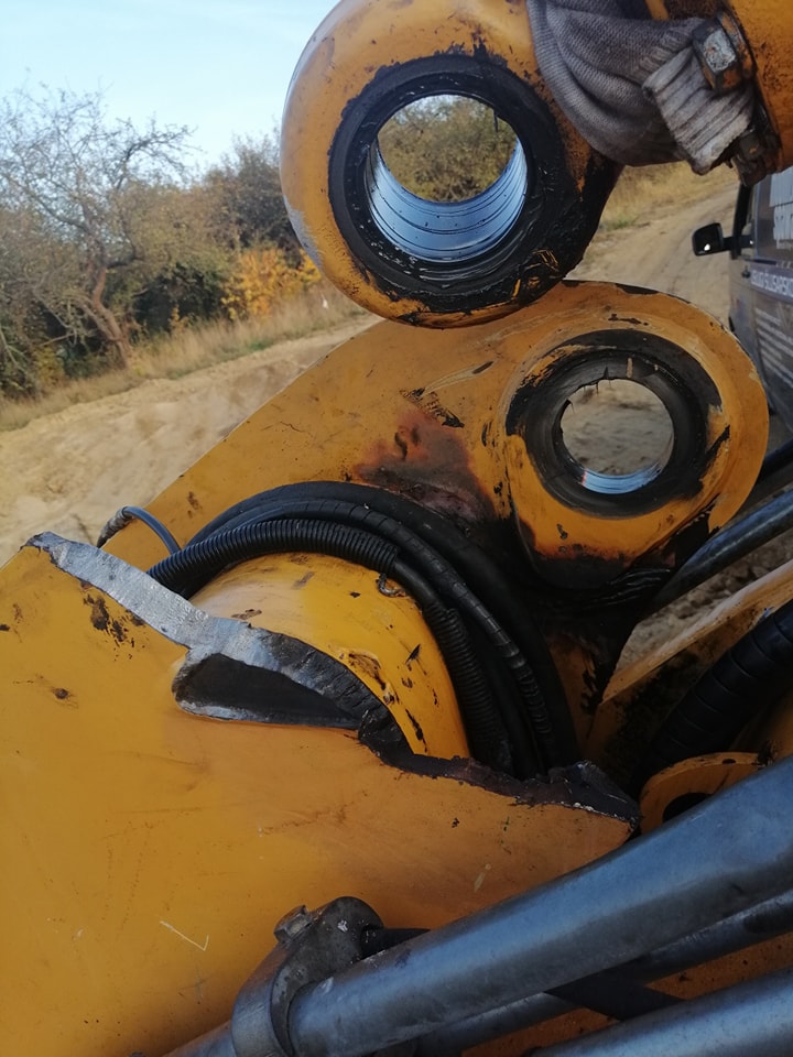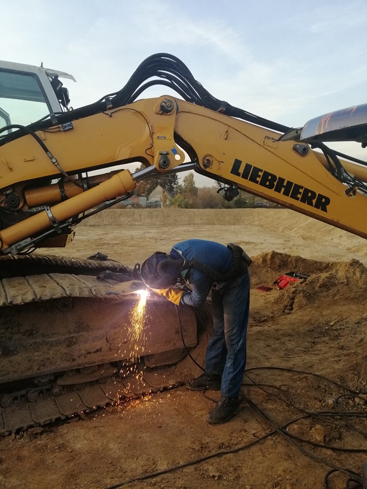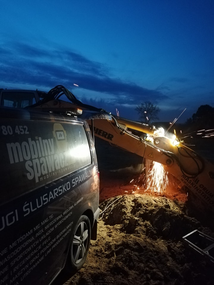 Nasz nowy pacjent to koparka z pękniętym uchem ramienia. Spawanie odbyło się w nocy. Wycięliśmy pęknięcia i wzmocniliśmy odpowiednio dodatkowym materiałem w postaci blach. Naprawa została wykonana z użyciem agregatu prądotwórczego.